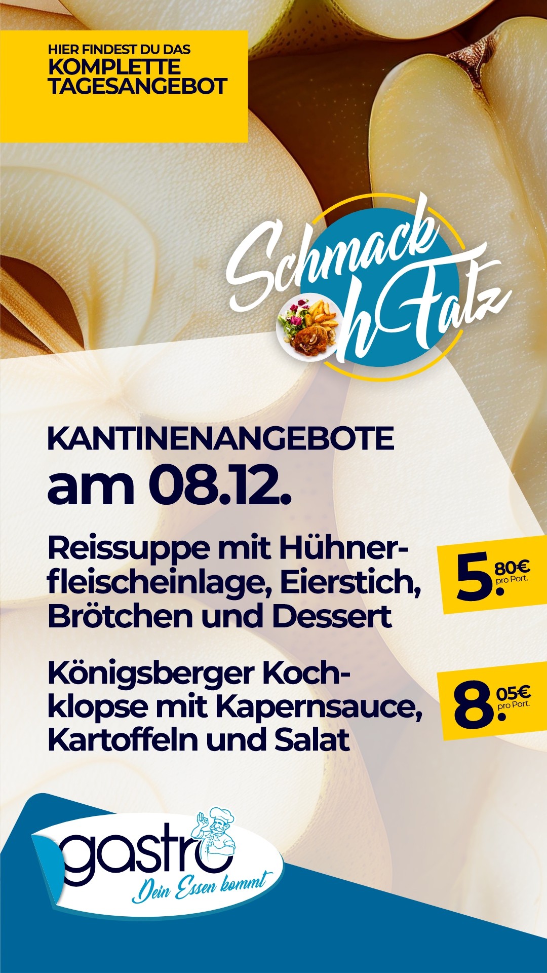| *ANGEBOT* Königsberger Kochklopse mit Kapernsauce, Kartoffeln und Salat + Getränk | 8,65 € |