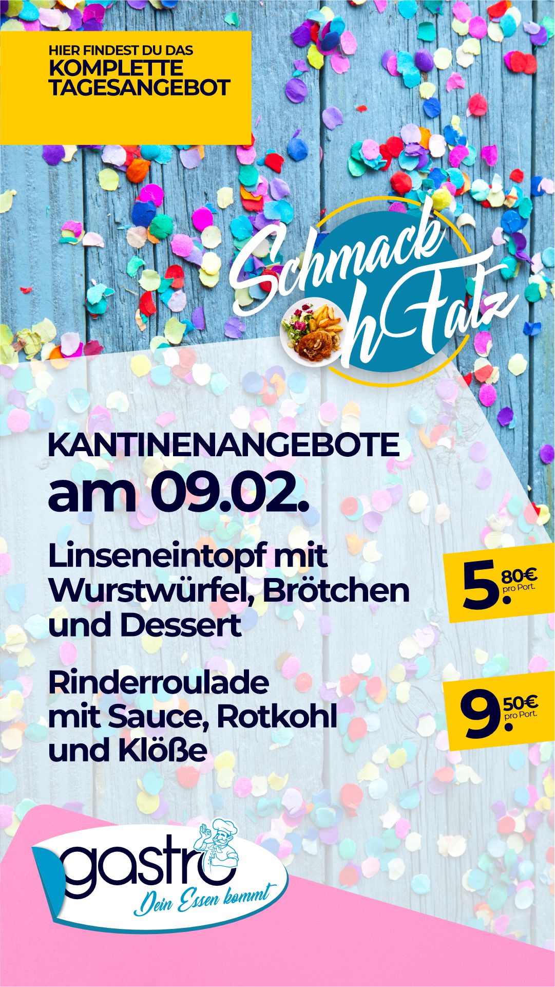 | Linseneintopf mit Wurstwürfel, Brötchen, Dessert | 5,80 € |