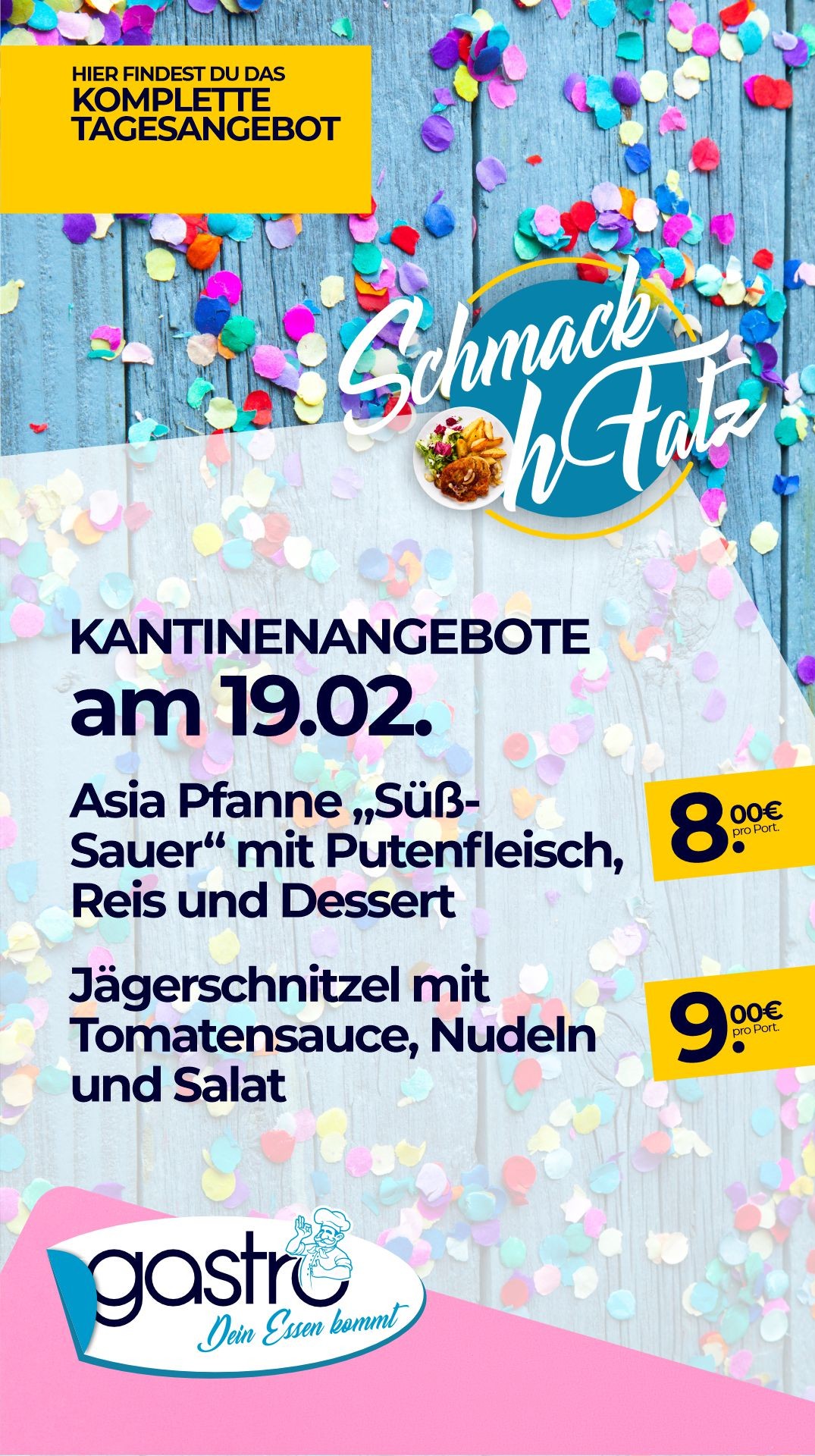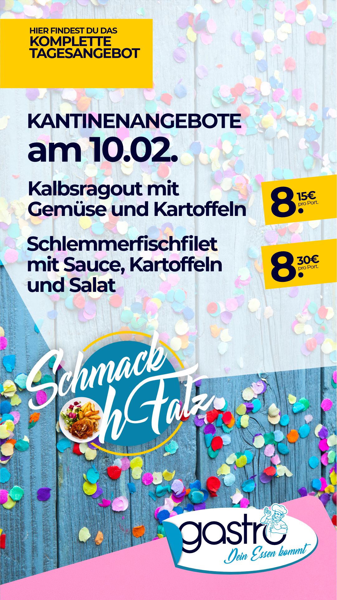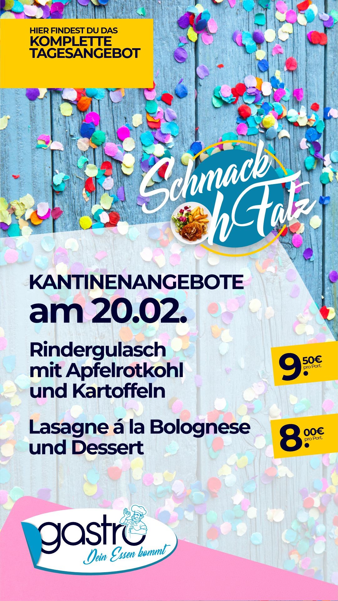 | Schweinegulasch, Nudeln, Salat | 8,10 € |