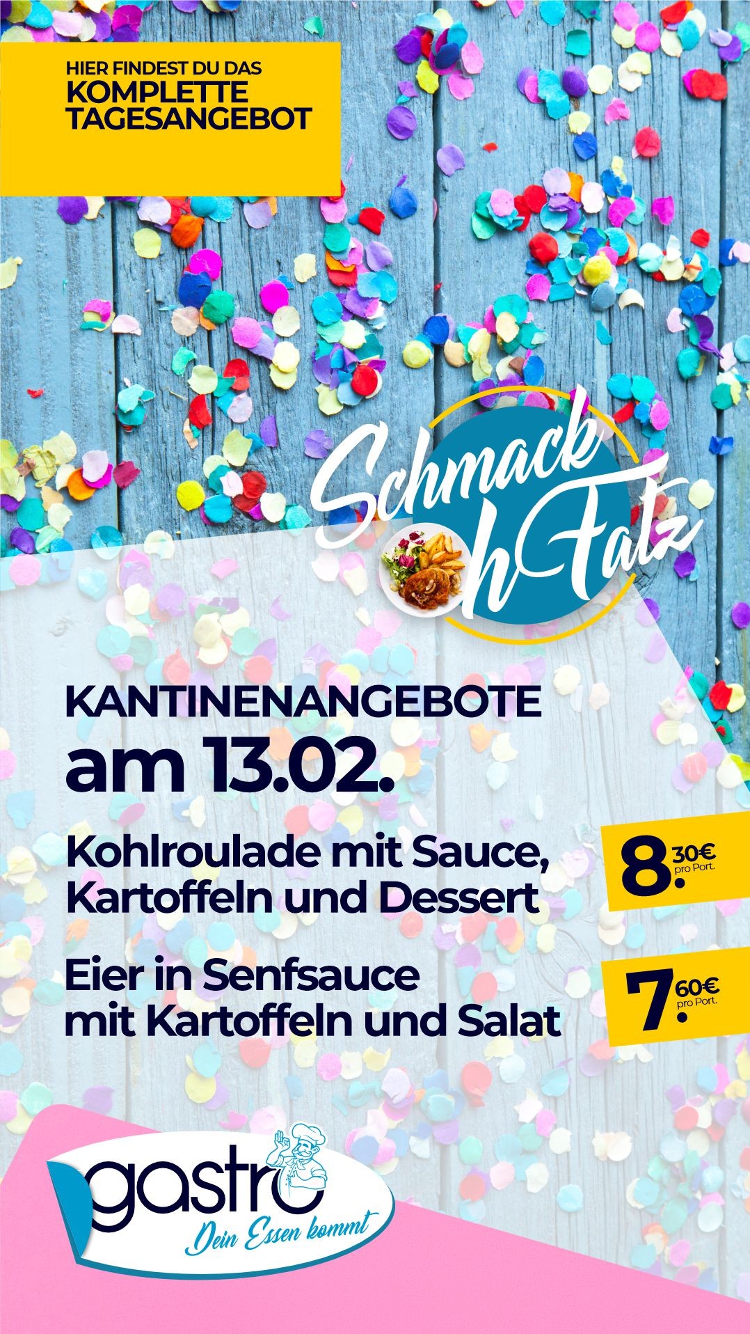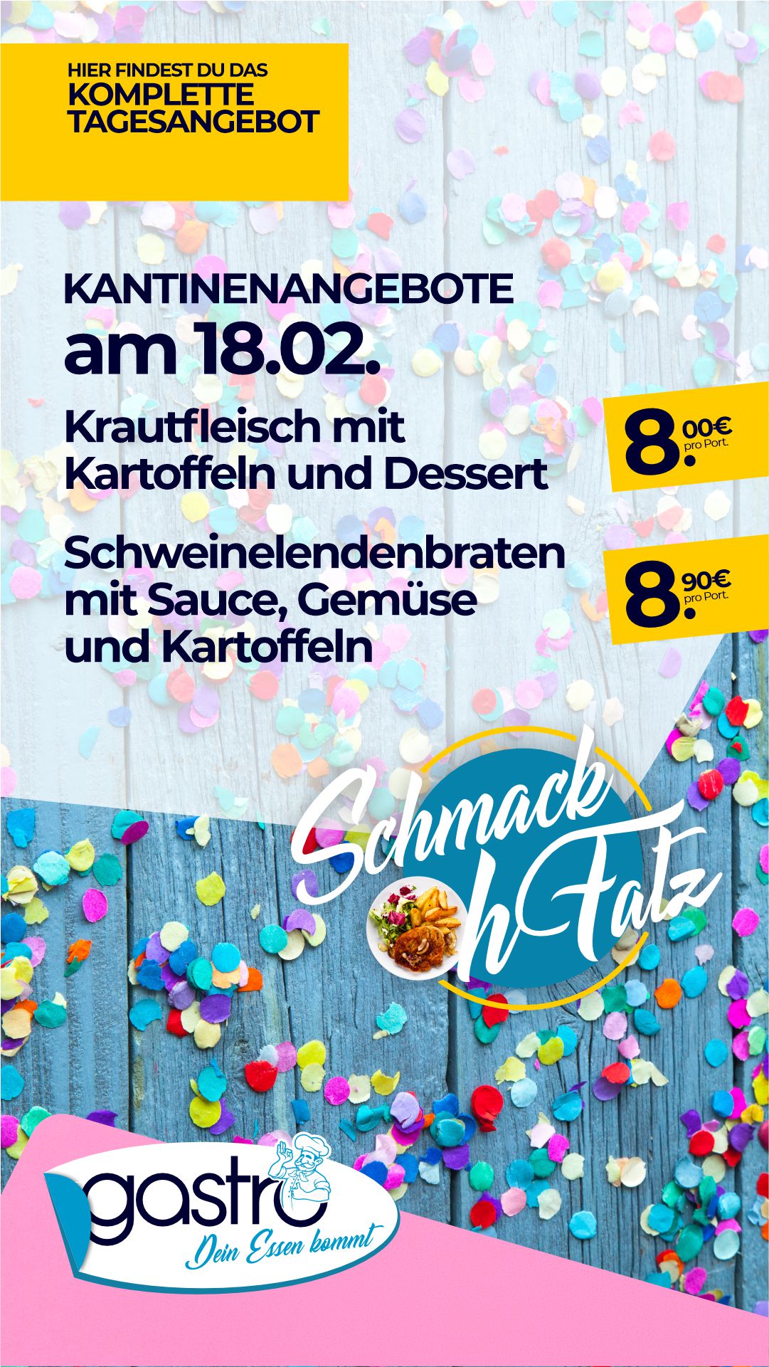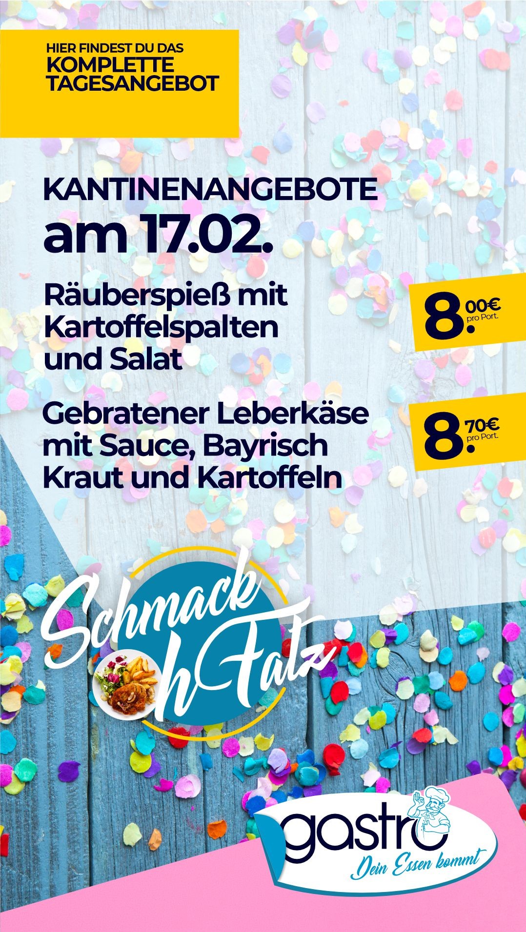 | Kasselerkotelett mit Sauce und Kartoffeln, dazu Salat | 8,40 € |